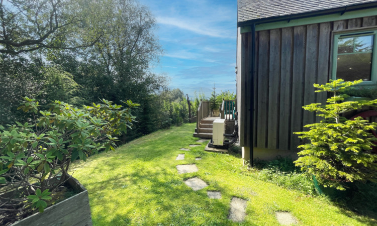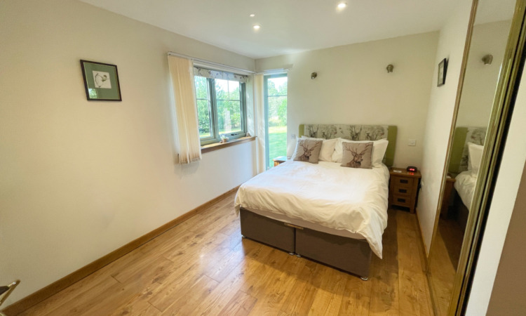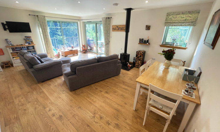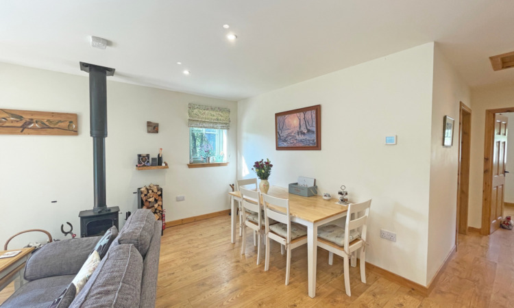 In addition to its pleasant surroundings the property further benefits from air source heating supplemented by a woodburning stove, thermostatically controlled underfloor heating, double glazing that include sliding patio doors leading out to a framed decking area, quality wood laminate flooring throughout with the exception of the bathroom/en-suite, spotlights throughout and quality fitted internal doors. There is a wrap around lawn garden and hard standing for 3-4 vehicles.